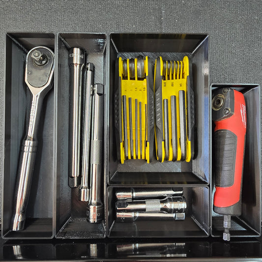 The RhinoGrid system is a modular snap-to-grid organization system for drawers, toolboxes, desks, nightstands, or any other horizontal surface. Each RhinoGrid product can magnetically snap to any other RhinoGrid product. No baseplate is required. RhinoGrid is based off of 2" square increments.