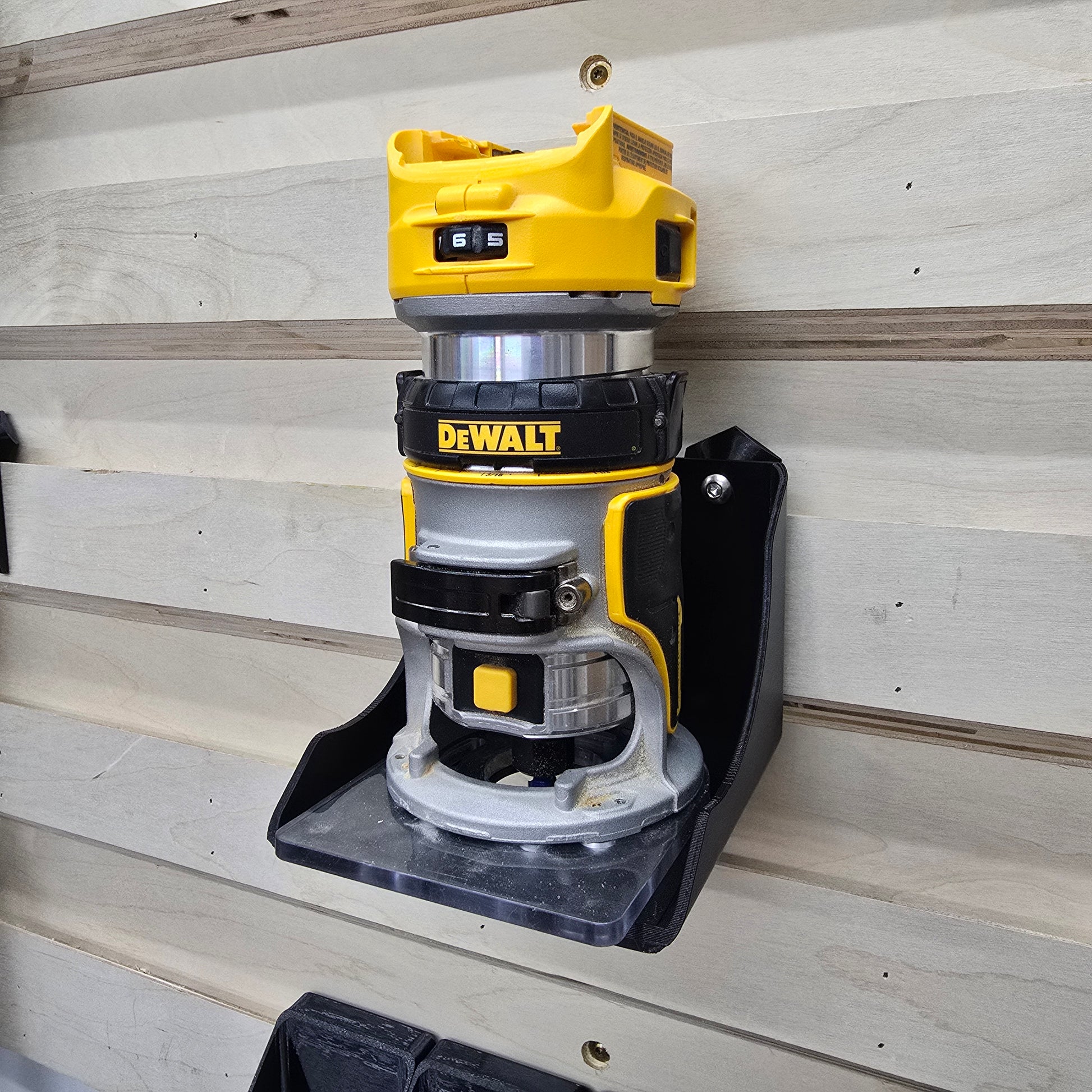 A French Cleat Tool Holder to a cordless trim router. The tool holder mounts to a French cleat wall at least 3/4" thick.